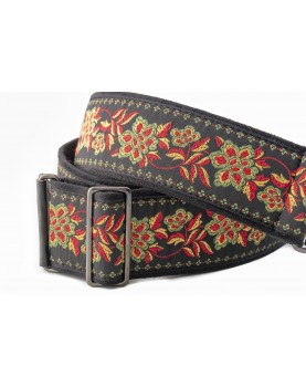 Courroie modèle ROSES II, tissu Jacquard, doublure microfibres, extrémités 100% synthétique, rembourrage haute densité, largeur 6 cm, longueur 90 à 150 cm, porte-médiators intégré.