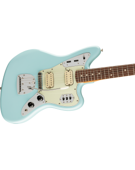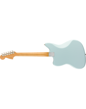 Pour faire jaillir le son de géant de cette petite merveille à diapason court, nous l’avons équipée d’une paire de micros humbucker Atomic™ à haut niveau de sortie. Ils peuvent aisément pousser un ampli à lampes jusqu’à une magnifique overdrive tout en conservant le son précis qui a fait la réputation de Fender. Le manche au profil ”Modern C” est surmonté d’une touche en érable au radius de 9.5” (241 mm) avec 22 frettes medium jumbo, garantissant ainsi un toucher moderne. Un chevalet Adjusto-matic™ est agrémenté d’un vibrato flottant Jaguar, tandis que les mécaniques de style vintage apportent une pointe esthétique d’époque, mais aussi des performances et une tenue de l’accord hors pair. En plus des contrôles de volume et de tonalité globaux, deux commutateurs coulissants sur la partie inférieure activent/désactivent chaque micro, cependant que le troisième active un ”tone cut”. Les molettes sur la corne supérieure permettent de choisir, pour chaque micro, entre deux modes Humbucker ou Simple Bobinage, afin d’accroître la variété sonore. Cette guitare présente également un kill switch monté sur la corne supérieure, un accastillage chromé et une plaque de fixation du manche à quatre vis. Une housse deluxe est incluse.