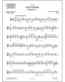Les Cinq Préludes de Heitor Villa-Lobos représentent la dernière œuvre pour guitare seule du compositeur brésilien, qui les écrivit durant l’été 1940. Ils ne constituent pas un cycle homogène, mais plutôt un ensemble composite de feuilles d’album, dont chacune développe de manière originale un principe stylistique différent. Sur le plan de la technique instrumentale, Heitor Villa-Lobos situe les Préludes un point d’équilibre idéal entre l’écriture encore tributaire du XIXe siècle de la Suite populaire brésilienne et l’audacieuse recherche instrumentale des Douze Études.