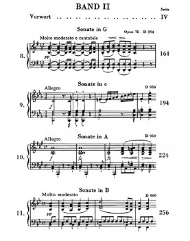 Les 22 sonates pour piano de Schubert reflètent très fidèlement le cheminement de ce compositeur disparu trop tôt. Partant des premiers essais effectués entre seize et dix-neuf ans, elles permettent de retracer l’évolution constante de son écriture jusqu’aux cinq grandes sonates composées entre 1823 et 1826, puis jusqu’aux trois sonates magistrales composées peu de temps avant sa mort qui le placent incontestablement au même niveau de maîtrise que Beethoven dans ce domaine. Le volume II de l’édition Urtext en trois volumes parue chez Henle contient la sonate en Sol majeur D 894 op. 78 ainsi que les trois grandes sonates en ut mineur, La et Si bémol majeur l’écriture aérienne et l’expression délicate avec lesquelles Schubert effectue un grand pas vers l’avenir et qui appartiennent aux canons classiques de la sonate pour piano.