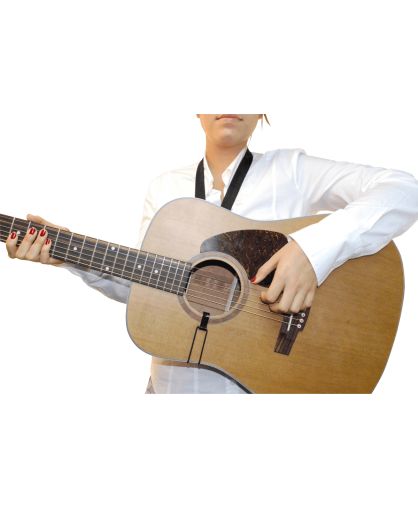 Cordon tour de cou simple, avec sangle réglable et crochet plastique se fixant sur la rosace de la guitare