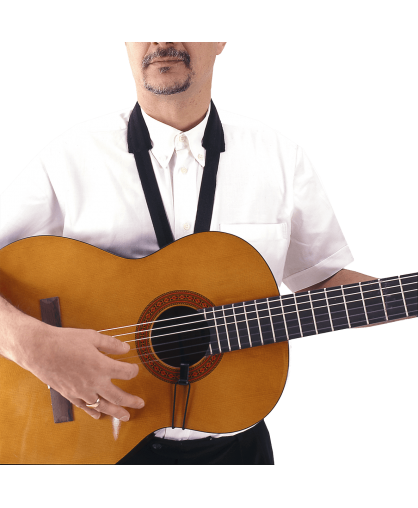 Cordon tour de cou doublé éponge, avec sangle réglable et crochet plastique se fixant sur la rosace de la guitare